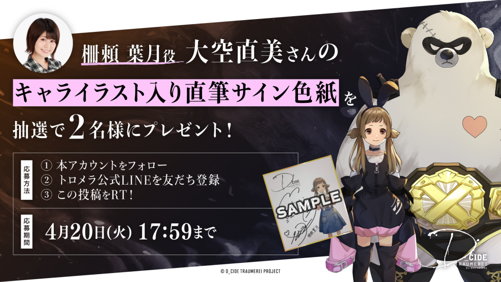 「ディーサイドトロイメライ」事前登録受付開始を記念して、柵頼葉月役 大空直美さんのサイン色紙が抽選で2名様に当たるTwitterフォロー・LINE友だち登録キャンペーンを開始しました!ぜひこの機会に奮ってご応募ください!