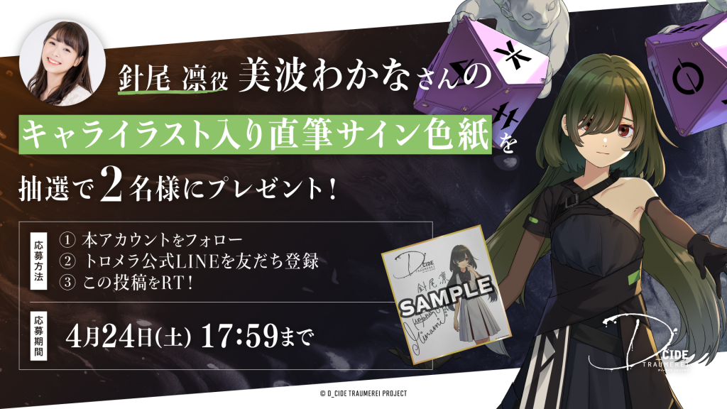「ディーサイドトロイメライ」事前登録受付開始を記念して、針尾 凛役 美波わかなさんのサイン色紙が抽選で2名様に当たるTwitterフォロー・LINE友だち登録キャンペーンを開始しました!ぜひこの機会に奮ってご応募ください!