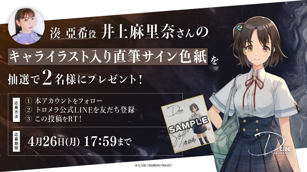「ディーサイドトロイメライ」事前登録受付開始を記念して、湊 亞希役 井上麻里奈さんのサイン色紙が抽選で2名様に当たるTwitterフォロー・LINE友だち登録キャンペーンを開始しました!ぜひこの機会に奮ってご応募ください!