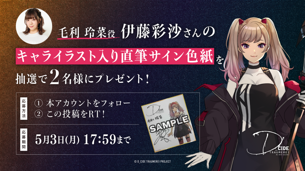 「ディーサイドトロイメライ」事前登録受付開始を記念して、毛利玲菜役 伊藤彩沙さんのサイン色紙が抽選で2名様に当たるTwitterキャンペーンを開始しました!ぜひこの機会に奮ってご応募ください!