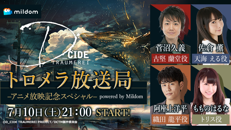 さらに、22:30からはいよいよ放送開始となるTVアニメ「D_CIDE TRAUMEREI THE ANIMATION(ディーサイドトロイメライ ジ アニメーション)」第1話のオーディオコメンタリー配信も実施!キャストと一緒にぜひリアルタイムでアニメ第1話をお楽しみください!