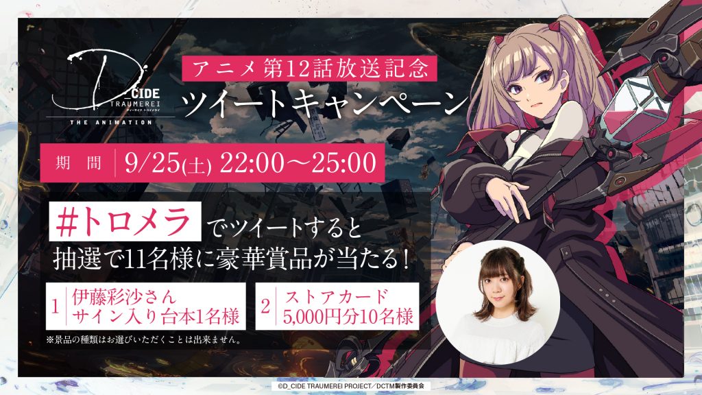 TVアニメ「D_CIDE TRAUMEREI THE ANIMATION」第12話の放送を記念して、毛利玲菜役 伊藤彩沙さんのサイン入り台本とストアカードが当たるTwitterキャンペーンを実施します!